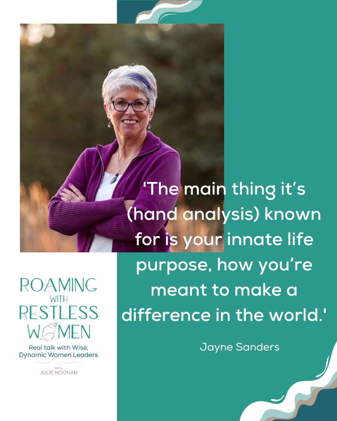 Today’s podcast guest is Jayne Sanders, the Purpose Whisperer, and a Law of Attraction & Spiritual Life Coach who uses the fascinating neurotechnology of Scientific Hand Analysis as her core assessment tool. Scientific Hand analysis is not palm-reading and has been featured in Forbes and on ABC’s The List. She helps business owners, executives, and leaders and their teams achieve the deep and more consistent joy, fulfillment, and success they crave.